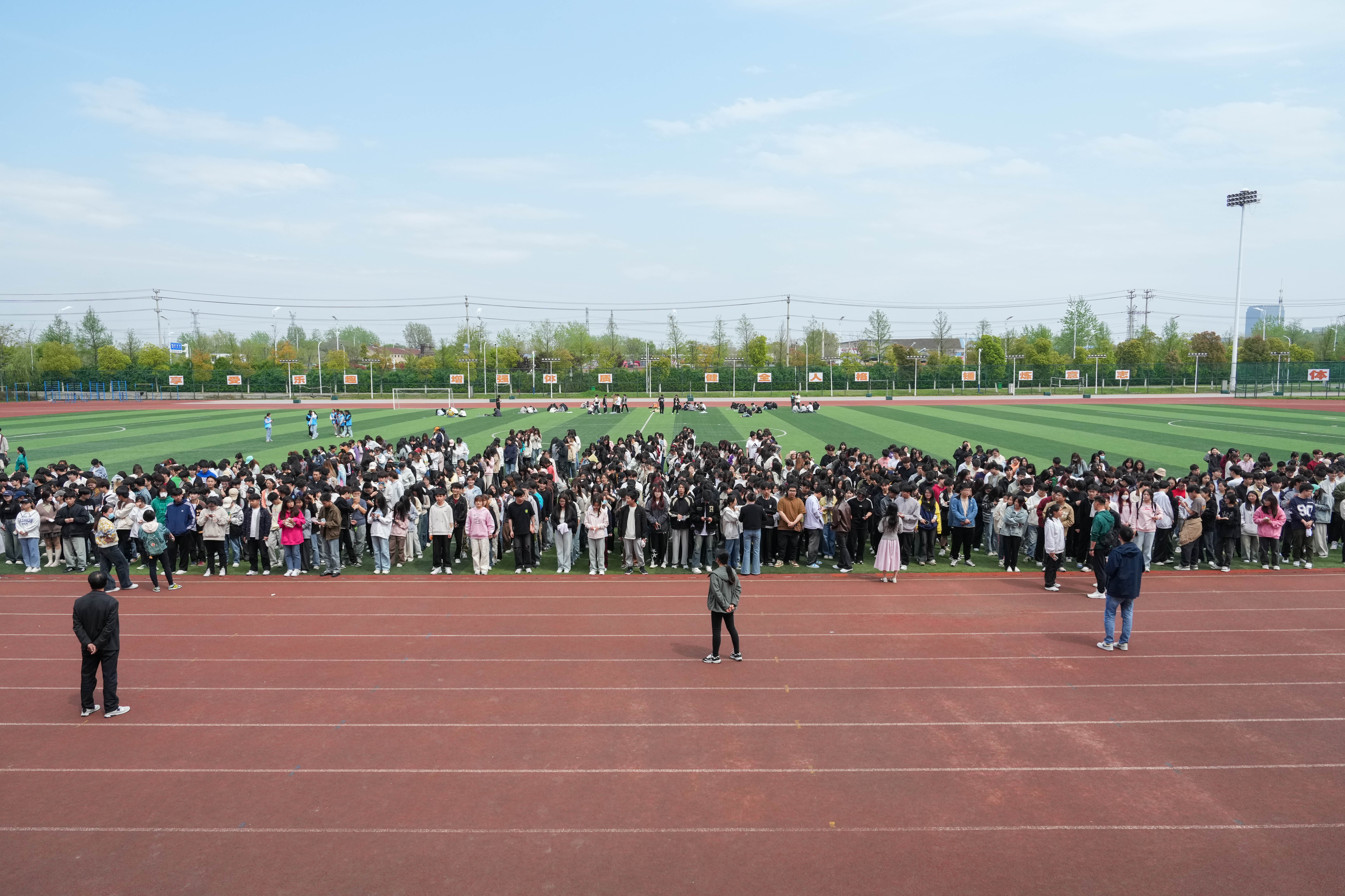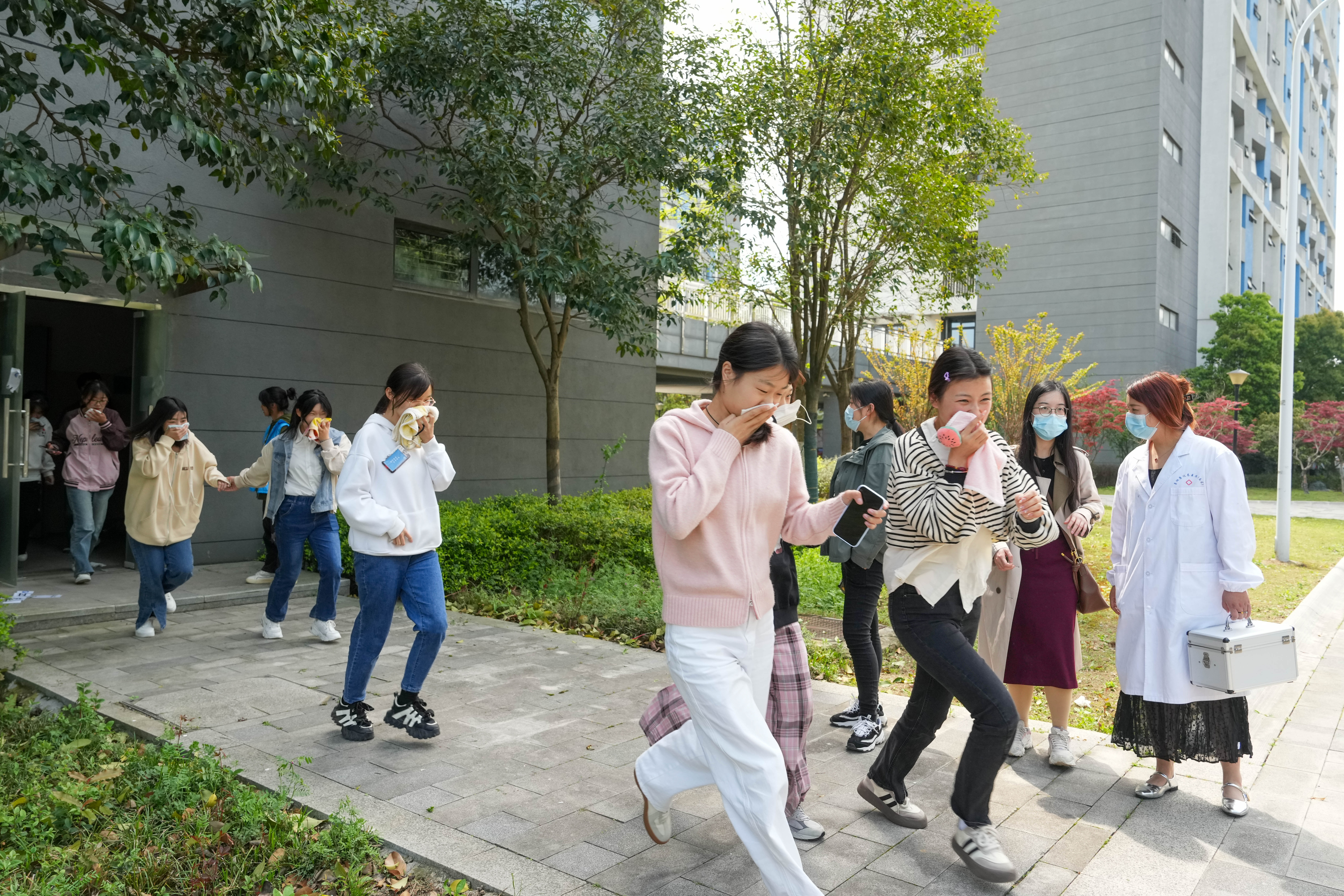 演练正式阶段,随着消防警铃响起,全体班主任及志愿者迅速到达各自负责的位置。同学们在班主任及志愿者组织下捂住口鼻,弯腰低身,按照逃生路线有序逃生。疏散至指定安全地带后,各班迅速清点人数,以年级为单位向活动总指挥报告。
