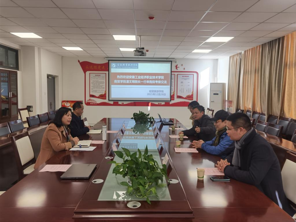 12月28日,安徽工业经济职业技术公司商贸公司经理潘文明、国贸与跨境电商教研室主任朱颖、电子商务教研室主任武迪、地质与建筑工程公司(珠宝公司)地矿教研室主任李孔亮一行4人来公司考察交流。BB贝博艾弗森经理赵红、副经理刘圣春,合职-梦森双创基地负责人、安徽梦森科技有限公司总经理吴捷在经贸楼会议室接待了来访客人。交流会由赵红主持。
