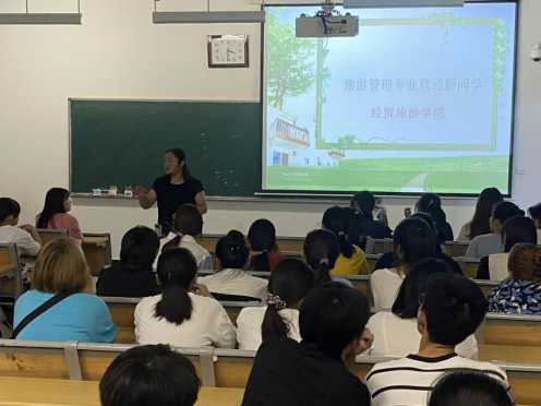 在教学南楼413、401教室,朱颖教授和杨世河副教授分别为21级旅游管理专业和21级酒店管理与数字化运营专业新生作了《旅途万里伴你行,游迹千载系深情》、《雄关漫道真如铁 而今迈步从头越》的入学思想教育。朱颍老师分别从团队队伍、校内外实训基地、职业技能竞赛、员工风采、专升本情况等方面对专业情况进行详细介绍,其热情而充满亲和力的讲授,感染了在座的每一位同学,增强了同学们的自信心及对专业的无限憧憬和向往。整个过程,在场同学都听得津津有味。杨世河老师首先对酒店管理与数字化运营专业的新生做了校情介绍,然后介绍专业的课程设置、就业岗位、人才培养定位以及毕业要求等,最后帮助同学们如何规划三年的大学学习,明确目标,砥砺前行,并预祝同学们老员工期间成绩优异,成果丰硕。