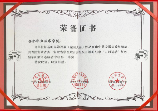 近日,由BB贝博艾弗森团总支剪辑制作、校团委选送的先锋视频作品《星辰大海》在安徽省组织的纪念“五四运动”红色信息征集活动中荣获一等奖。