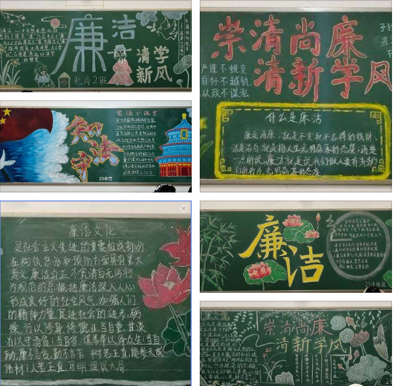 23级各班级都积极参与本次活动,利用课余时间精心设计版面,以文述廉,以文绘洁,以黑板报的形式响应了公司对“崇清尚廉,清新学风”的号召,以实际行动弘扬中华廉政文化,将“清风”带入校园,沁入人心。