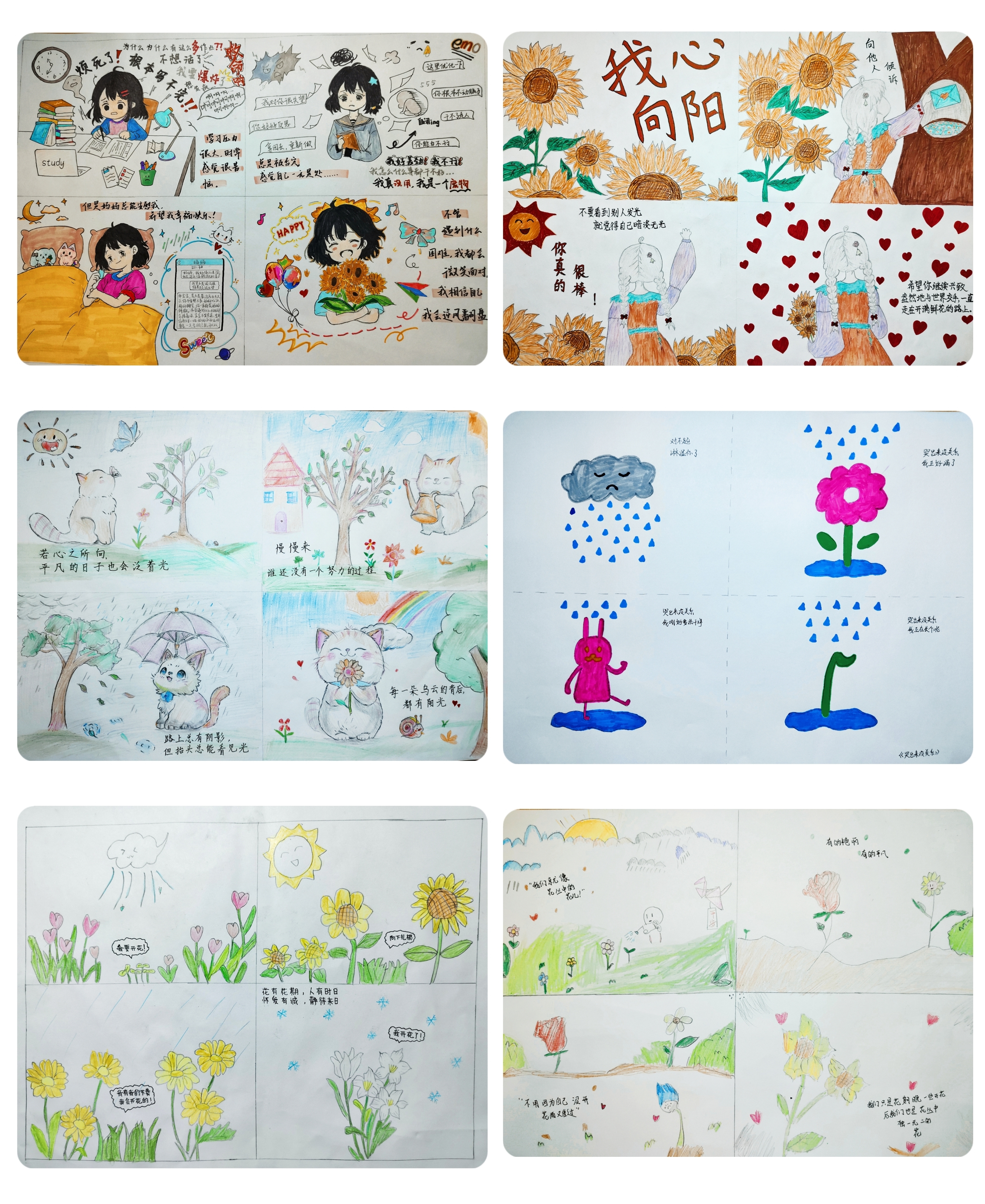 同学们踊跃投稿,用画笔描绘出丰富多彩的内心情感世界和对心理健康的独特理解,把自己在生活与学习中的所见所闻、所感所想用四格漫画形式艺术性地表达出来,散发着强烈的治愈力量。