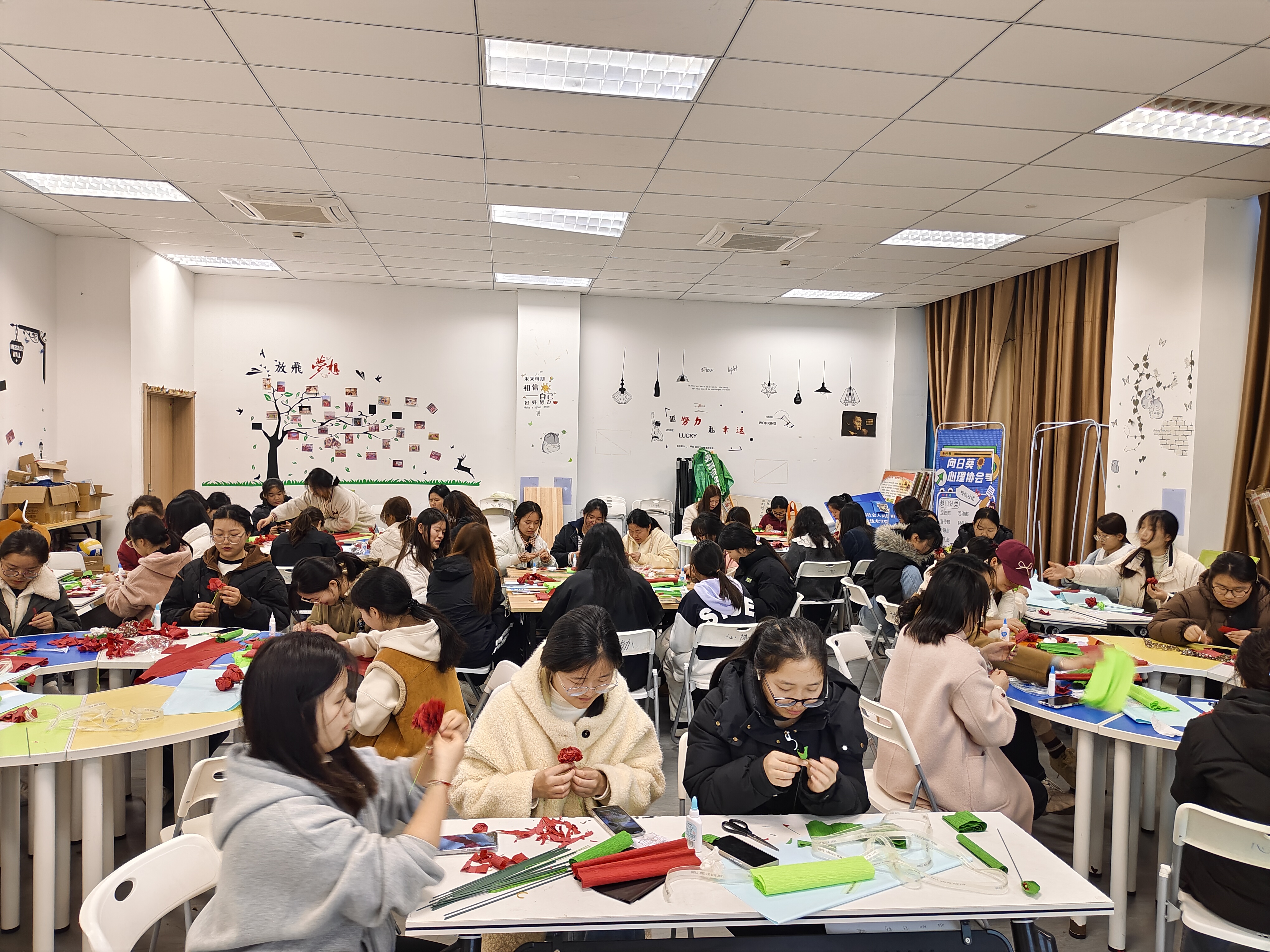 活动现场,大家在志愿者的引导下以小组为单位签到领取制作材料。接着同学们轻轻闭上眼睛,聆听着《萨提亚冥想》中的《接纳并欣赏自己》,在指导语引导着大家逐渐放松身心,进入冥想的世界。在冥想过程中,大家感受到了放松和平静。冥想结束后,志愿者讲解了玫瑰皱纹纸花的制作步骤,在轻音乐的陪伴下,大家也纷纷动起手来,开始进行创作,须臾间一朵朵鲜艳的花朵在团辅活动室盛开,轻音乐中的鸟叫声和室外的细雨声相映衬,大家仿佛置身于一个鸟语花香的世界。