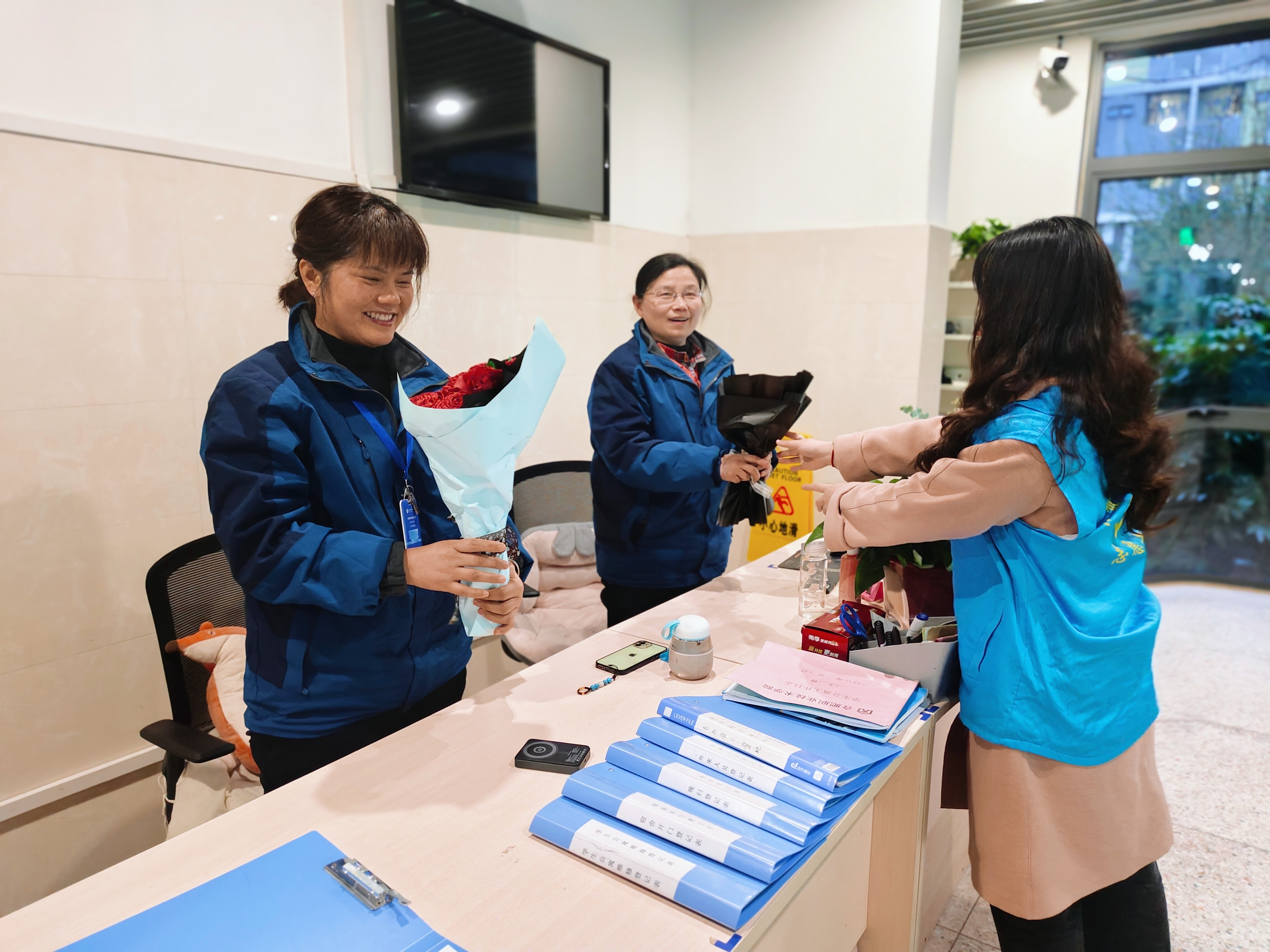 活动结束后,志愿者收集大家的成品花束,化身春日使者将大家的心意送给了宿管阿姨、食堂大叔和老师们。
