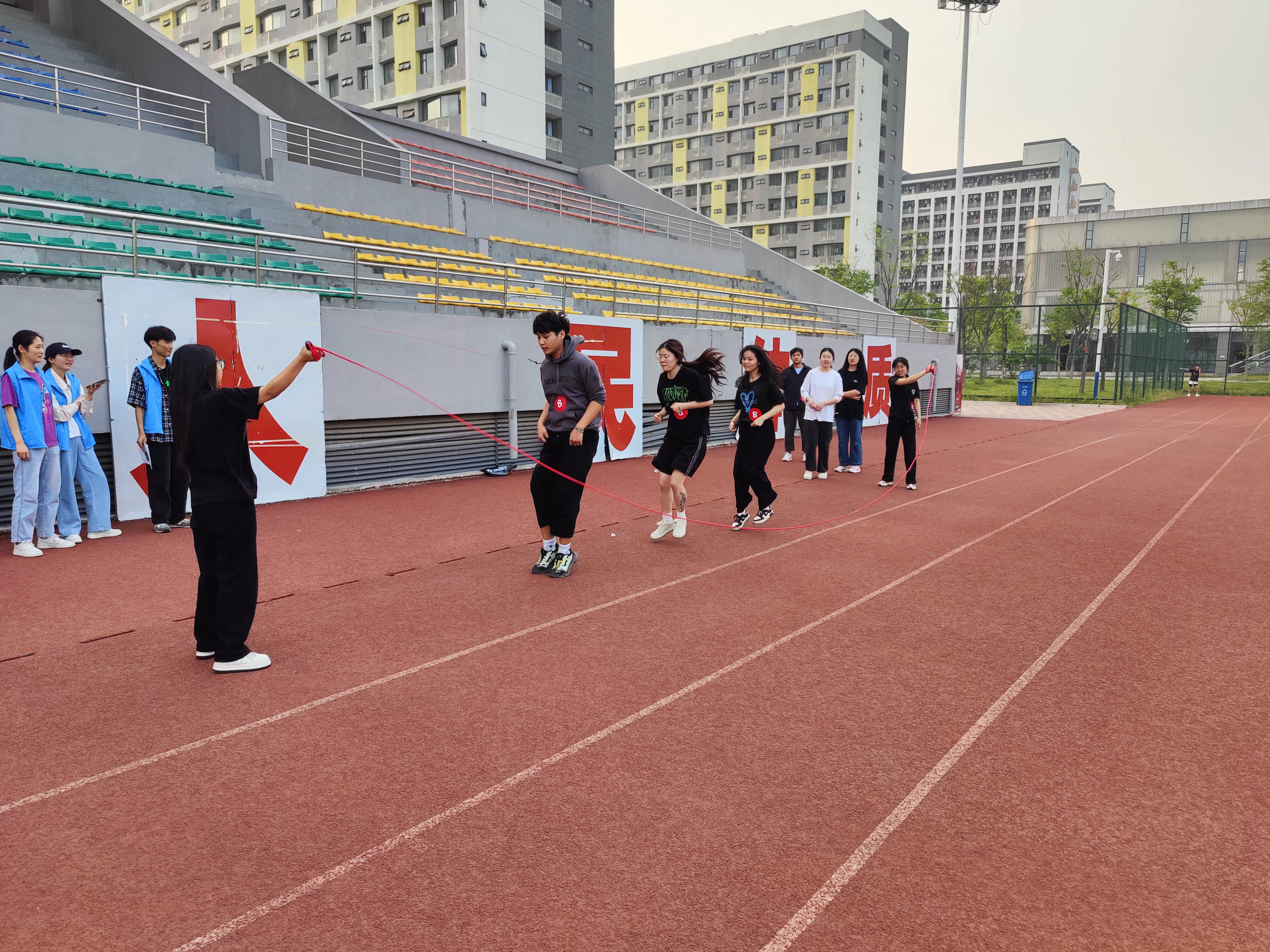 绳舞飞扬项目需要两个同学摇绳,其余六位同学依次进入,最后一名同学进入绳内跳满六下即成功。大家一个接一个在长绳下跳动,即使出现了失误,队友间也不会责备,而是互相鼓励。