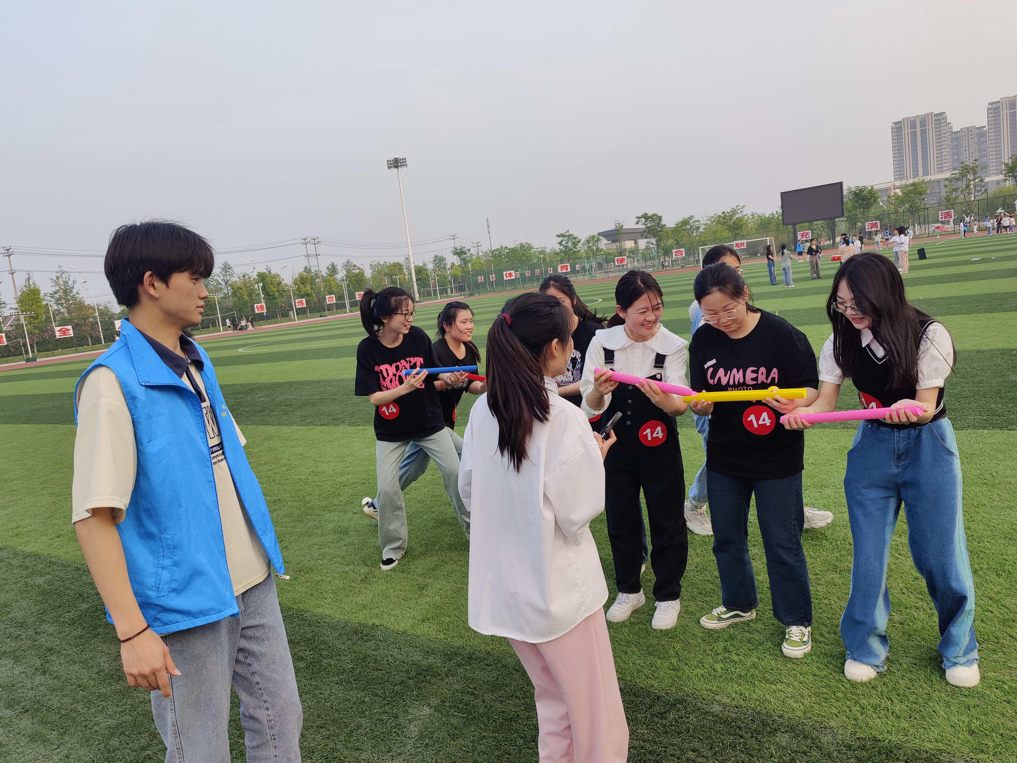 本次趣味心理运动会一共有四个项目,分别是击鼓颠球、珠行万里、接力营救和绳舞飞扬。活动以八人一组为单位报名参加,比赛采取团队积分制。活动现场,志愿者们早早准备好了比赛的道具分散在四个位置等待队伍上场,16支队伍在以打卡的方式依次参与每项活动。