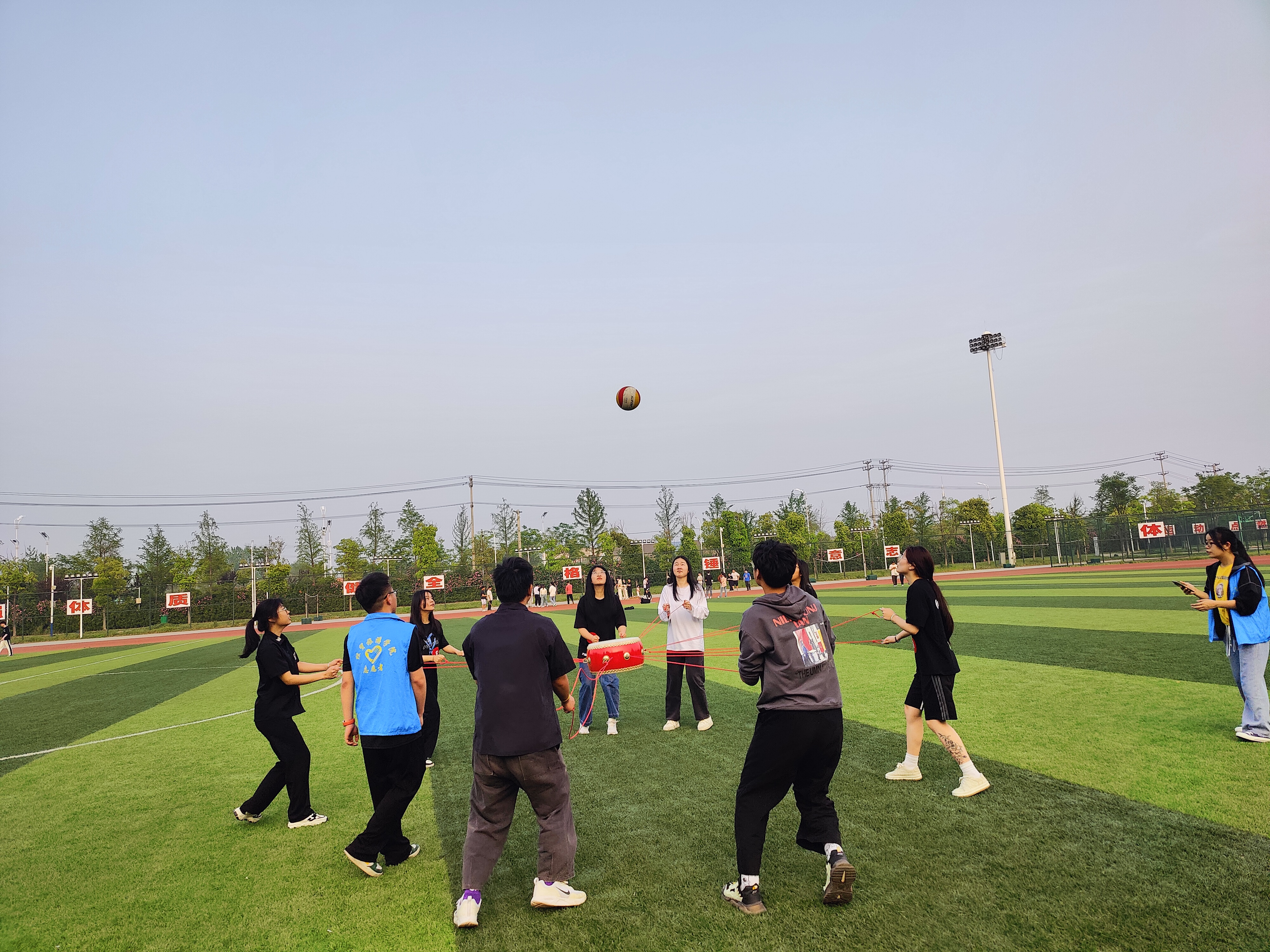 击鼓颠球项目,小组八人齐心协力,虽然颠球过程中失误不断,但是大家都坚持向着同一个目标,争取拥有好成绩!
