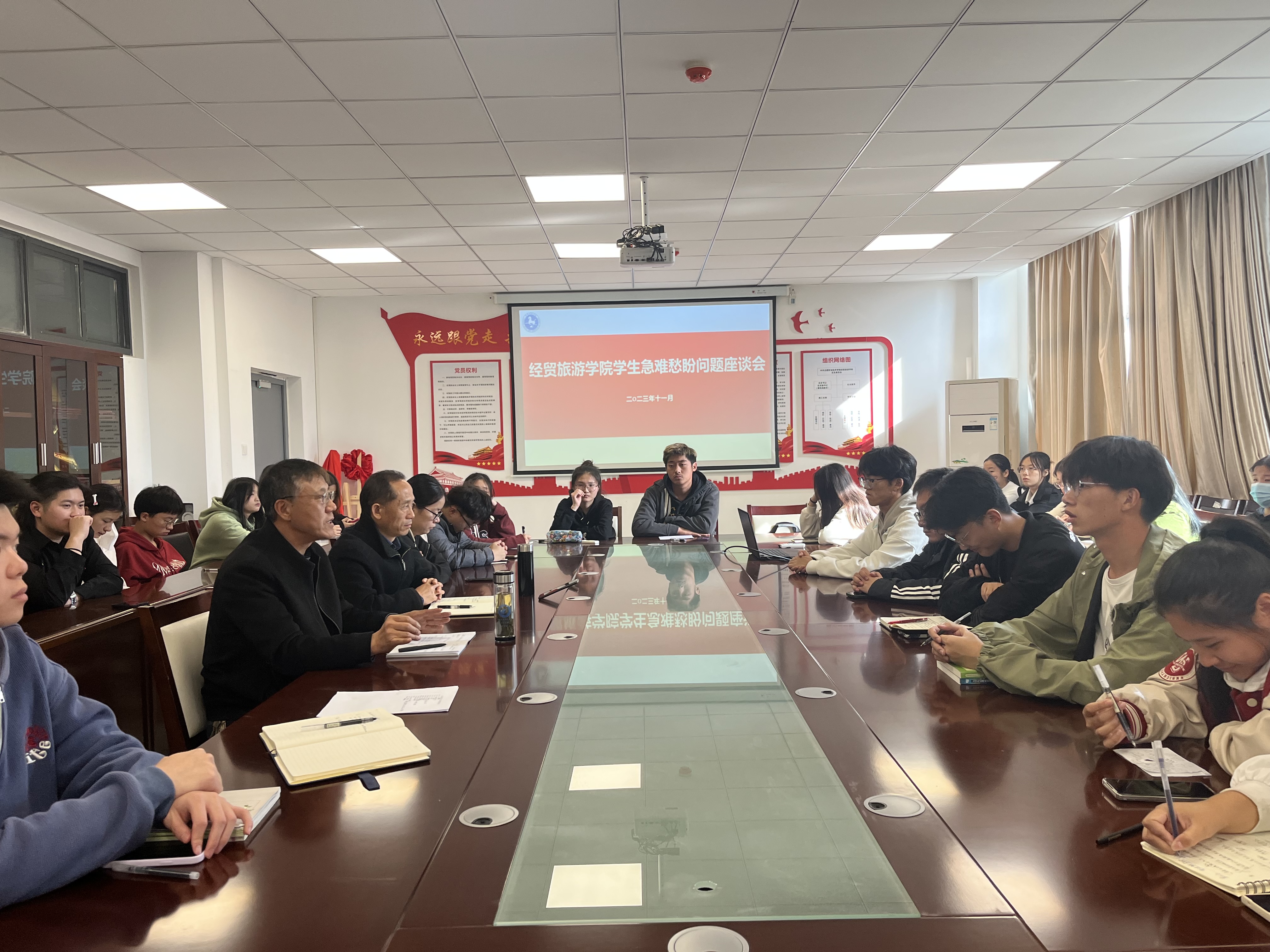 董老师指出,本次座谈会的目的在于了解员工的学习情况和生活情况,倾听员工在学习和生活等方面的急难愁盼,为员工提出建议和切实可行的解决办法。此次座谈会旨在畅通公司领导与员工的沟通渠道,构建的是开放、包容、实事求是的交流平台,广老员工代表可以畅所欲言,踊跃表达自己的意见与建议。接下来,同学们积极踊跃地发言,并结合自身情况,围绕着专业学习、学习兴趣、宿舍生活、后勤服务等方面纷纷提出自己的问题。